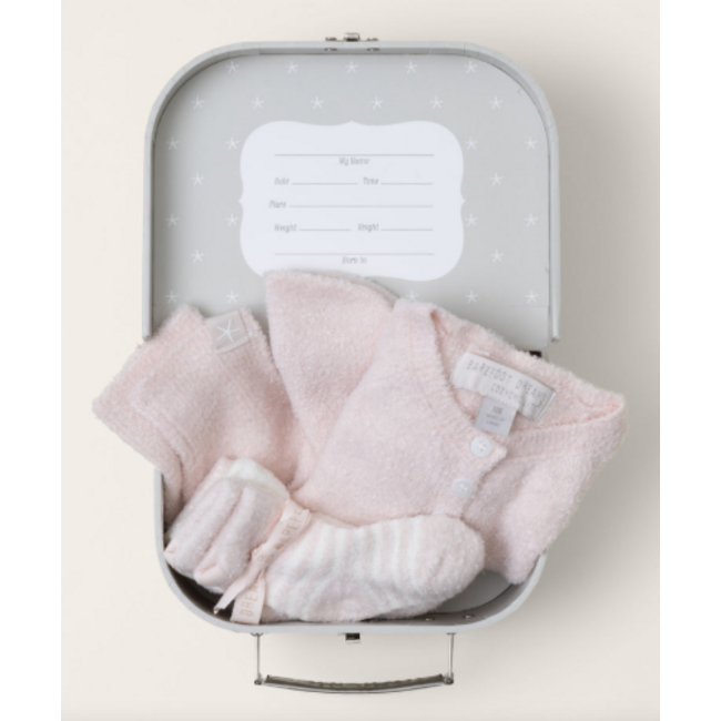 Each suitcase ensemble includes a cardigan, pull on pant, beanie and three pairs of socks. The suitcase doubles as the perfect keepsake box that details important info; Name, Date, Time, Place, Height, Weight and Born to. Read more.