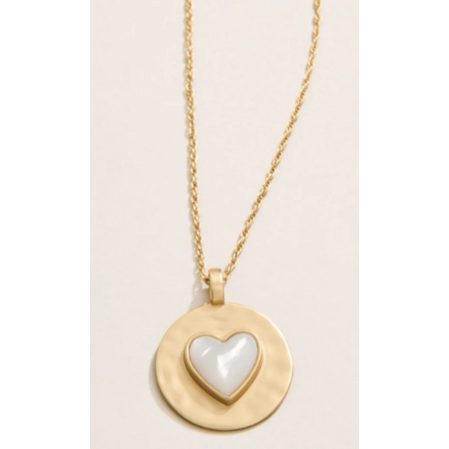 Capture the warm feeling of a full heart in this show-stopping Mother-of-Pearl Spartina necklace. A thick piece of shimmering Mother-of-Pearl is set in a lustrous 18kt matte gold-plated setting on a classic oval chain. Timeless and lovely.