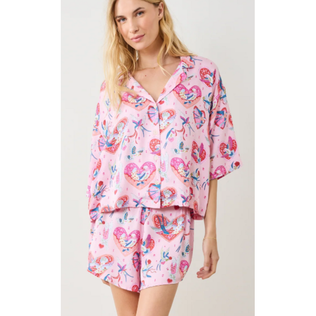 This silky pajama set features birds and hearts on luxurious Eco Satin. The slightly cropped top and breathable satin shorts set offer relaxed comfort with a softly flowing silhouette, perfect for romantic evenings year-round.